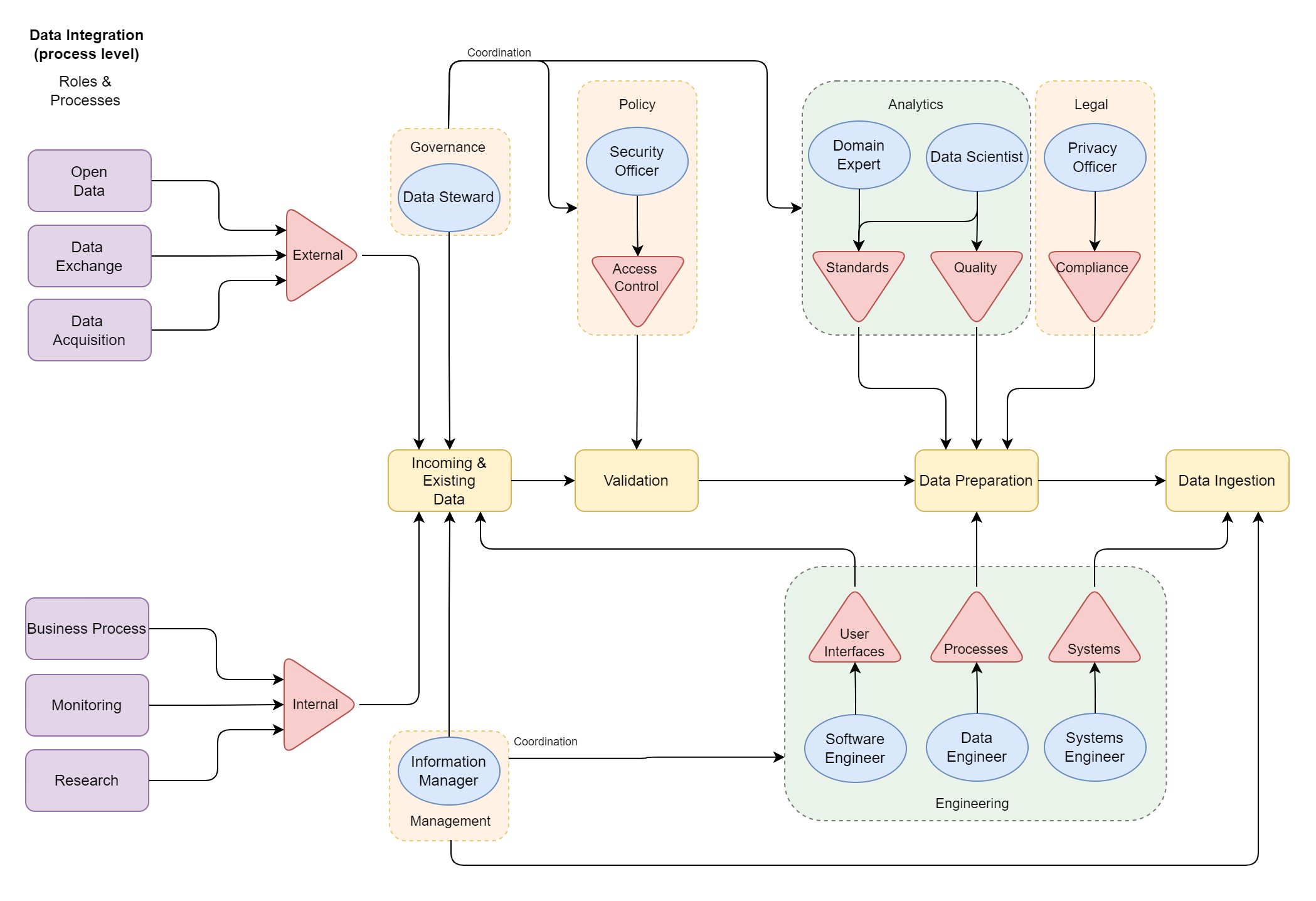 The Data Integration Workflow diagram describes the process level of the intake of FAIR data within an organisation. Data may be acquired internally or externally and may come in various formats. The Data Steward is responsible for the policy and semantic-level handling of these data, while the Information Manager is responsible for the secure and proper technical processing of data.