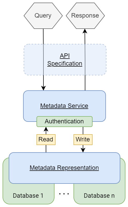The second component is a reference implementation of the metadata registration service: A service implementing the API specification. It contains an authentication system to allow maintainers to define and update metadata. Read-only access to the data is public. It includes FAIR Accessor and Security Enforcer architecture blocks.